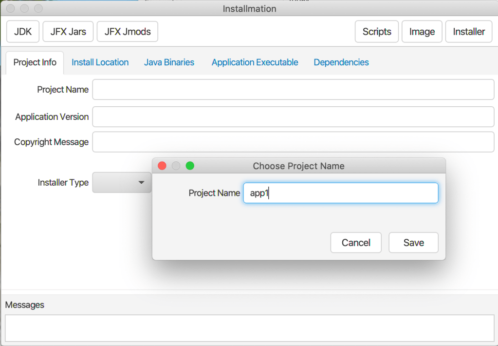 Create a new project and save it. All files are saved in the <user.home>/.installmation directory. Fill in the project name, and set the installer type to pkg. The other fields are optional and will default to sensible values.